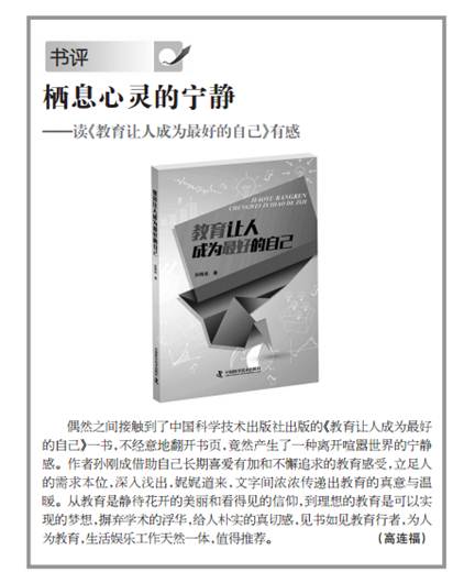 2015年10月27日,《中国企业报》“人文·生活”版刊发中国社会科学杂志社高连福研究员的书评“栖息心灵的宁静——读《教育让人成为最好的自己》有感”,高度评价公司教师孙刚成的专著《教育让人成为最好的自己》。