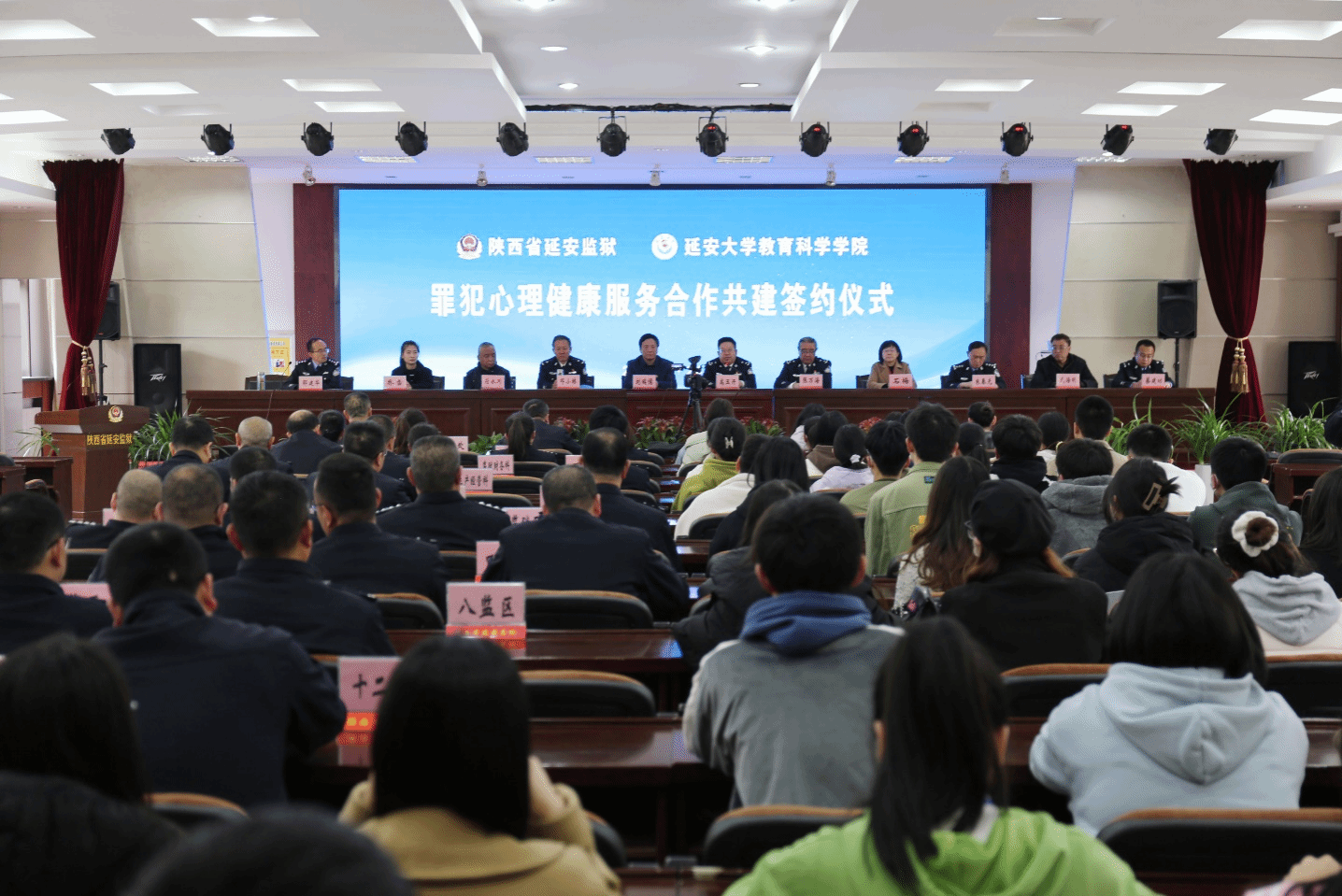 2023年4月24日下午,公司威廉希尔中国官网与陕西省延安监狱合作共建协议签约仪式在延安监狱举行。公司威廉希尔中国官网经理刘瑞儒,心理咨询中心主任石梅,心理系主任符永川,原威廉希尔中国官网副经理武海明,威廉希尔中国官网辅导员乔雪及心理学专业20级全体员工;延安监狱党委书记、监狱长高玉开,党委副书记、政委张万海,党委委员、副监狱长邓小林、朱春光、邵建华,监狱企业副总经理蔡建功及延安监狱部分中层领导和干警近百人参加了签约仪式。签约仪式由邵建华同志主持。